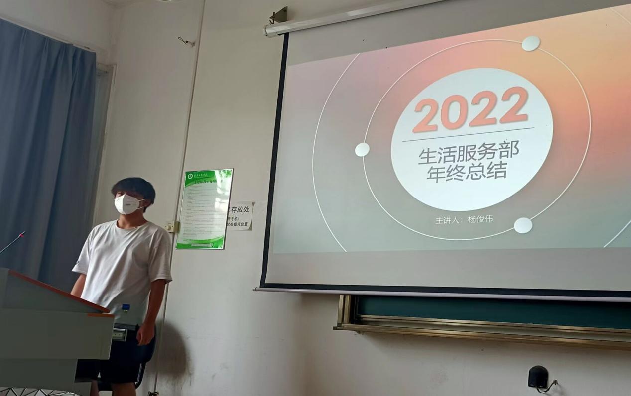 此次会议由甘文涛、王若嫣共同主持。各部门成员代表依次对2021-2022年度的工作进行了汇报和总结。报秘书处汇报了其部门主要负责每周例会相关事宜、院内或者学校颁布任务的人员安排、学院官方QQ的运营、学生会的资金流动以及上学期的年终表彰大会的主持。学习服务部讲述了本学期中学习服务部主要负责每两周一次的周周五百行的发布和统计,在2021至2022年上学期一共发布了8次周周五百行,2022至2023下学期至此发布了7次。生活服务部工作汇报了这一年中他们部门负责了“特色寝室”的创建活动,及优秀寝室的展示。实践服务部汇报乐其部门在这一年中负责了拉取社团赞助,篮球赛事的照片拍摄,策划案的撰写,还举办了电信防诈骗短视频的活动。权益服务部讲述了在这一年中他们部门主要负责了学生会成员考核的量化积分表的统计、篮球赛的围场和散场的工作、社团活动开展前教室的借用、协助实践部共同完成学院人大代表的选举活动、协同校会一起对跳蚤市场的举办进行维护。文体服务部对其部门在这一年中负责的大小活动进行了讲述和总结,包括了大一新生的升旗仪式的通知、新生杯篮球赛的举办、合唱比赛、舞龙和广播操的活动。