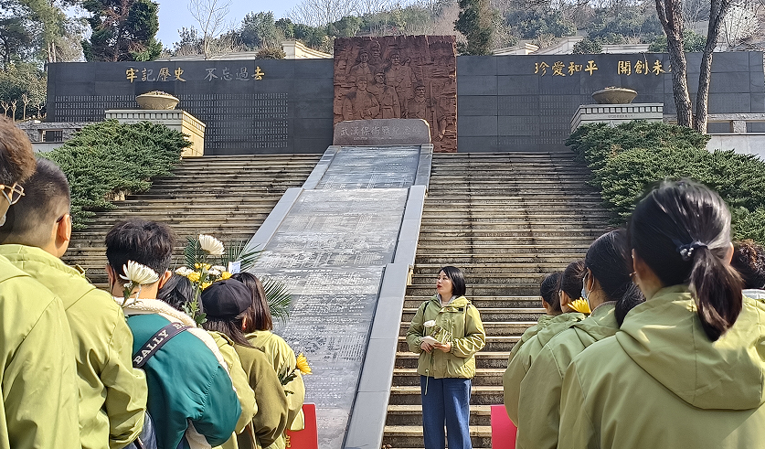 随后,教工党员们来到武汉抗战纪念园,由党总支书记吴艳主持开展“缅怀革命先烈”主题党日活动。党总支书记吴艳在无名英雄纪念碑前先向全体党员着重介绍了武汉的抗战史,并组织全体教工党员向为国捐躯的烈士们默哀三分钟。