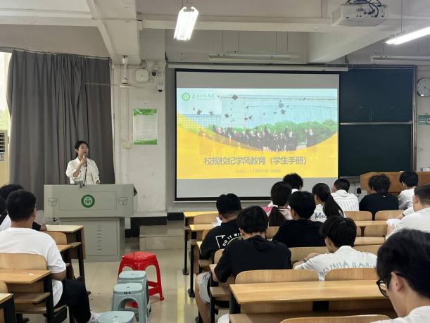 上午9时开展的课程是24级新生辅导员刘老师带来的校规校纪和学风教育,重点是向同学们传达学校关于校规校纪的各项文件要求。刘老师的课程从三个方面展开,分别是学籍与教学管理、学生管理和奖励资助。学籍管理中刘老师强调每一学年学生都要按时注册学籍和缴纳学费;课程须考试合格以及完成规定的学分;讲解关于休学复学和转专业的相关内容。学生管理方面,刘老师讲到在校学生须遵守校规校纪和校园文明行为。资助和奖励方面,刘老师向同学们讲解了学校具体有的各项奖助学金以及相应的参评条件和比例,勉励同学们学好专业课程,锻炼实践本领,争取在第二学年获得奖学金荣誉。