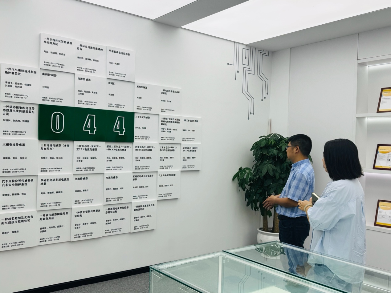 图为企业人事专员孟晓花为陈涛部长介绍企业专利墙