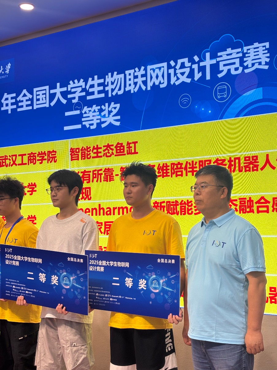 近日,2025年(第12届)全国大学生物联网设计竞赛全国总决赛在浙江大学玉泉校区圆满落幕。由beat365中文官方网站人工智能学院教师王勇指导,学生李朝阳、李铭煜、孙自天组成的参赛队,凭借出色发挥,从国内800余所院校3200余支参赛队中脱颖而出,斩获全国二等奖。