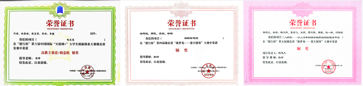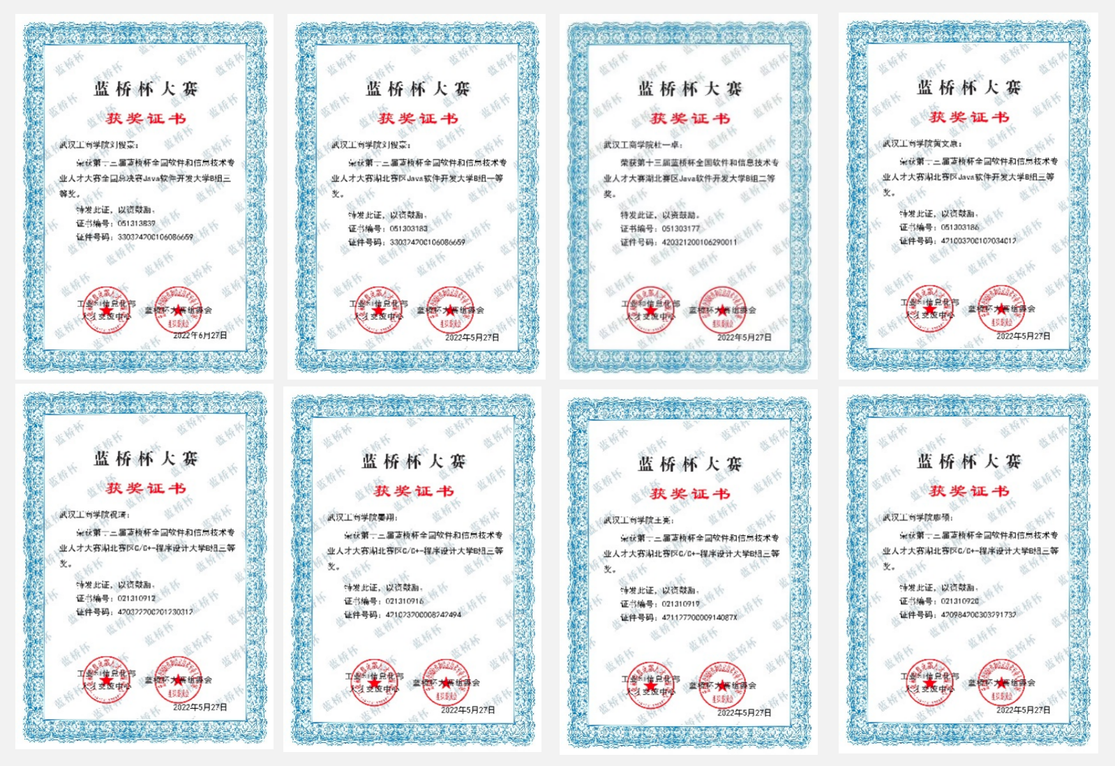 近年在物联网设计、“互联网+”、“蓝桥杯”程序设计大赛等知名赛事中获得的部分证书