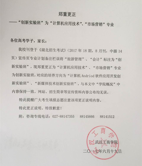 郑重更正 ——“创新实验班”为“计算机应用技术”、“市场营销”专业