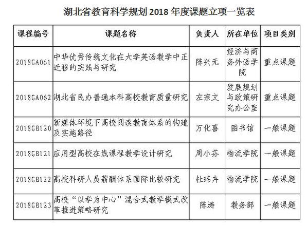据悉,2018年湖北省教育科学规划课题实行限额申报,学校共申请10项,获批6项,此次获批课题数量居同类高校前列。