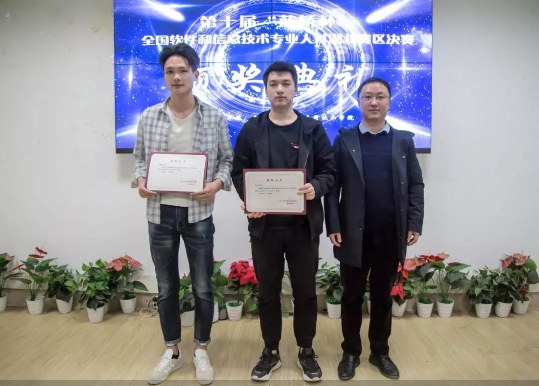 学校张俊副校长(右一)及省赛一等奖获得者17级计科袁鑫杰(左一),李子牧(左二)