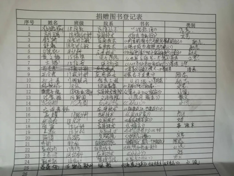 感谢以上来自各学院各专业可爱的人们,我们志愿者替詹大悲中学的学生们向你们说一声谢谢,是你们给他们提供了课外书籍也送上了你们的爱心。