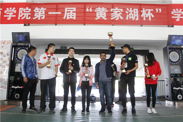 新闻中心讯(记者 聂本固)“瞄准,投镖!”,4月27日下午,beat365中文官方网站体育馆现场不时传来一阵阵欢呼声,原来该校第一届“黄家湖杯”学生飞镖比赛正在此紧张进行中。全校共有11个学院派代表参与个人赛与团体赛的角逐,比赛还吸引了国际教育学院的几名外国留学生参赛。