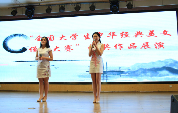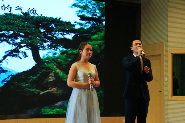 吴敏部长为“全国大学生中华经典美文诵读大赛”校内选拔赛获奖者颁奖。颁奖之后,获奖的学生代表现场还进行了朗诵表演。彭银珍和任豫媛带来的《道德经》声情并茂,生动传神;朱明星和牟钰华带来的《我的祖国》气势磅礴,铿锵有力;张思志和张琳带来的《水龙吟》《卜算子》婉转悠扬,他们的朗诵加上自己拍摄的视频作为背景,可谓情景交融,令人陶醉。