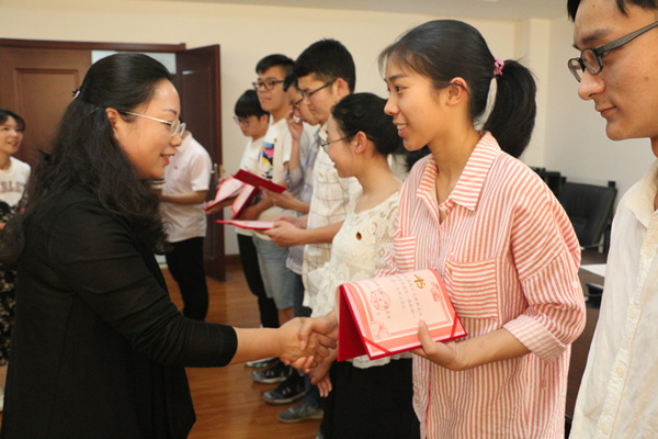 图为青菱街党工委委员、党建办公室主任李梅为王海燕同学颁发聘书 摄影:曲光浩