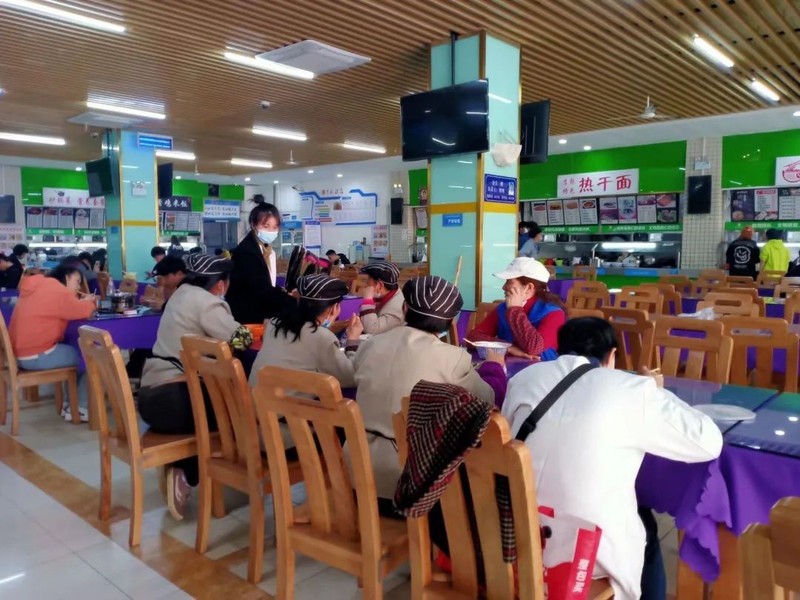 洁净的地板是她劳动的写照,倒映出灿烂的笑脸,让安静的食堂充满欢乐的氛围。