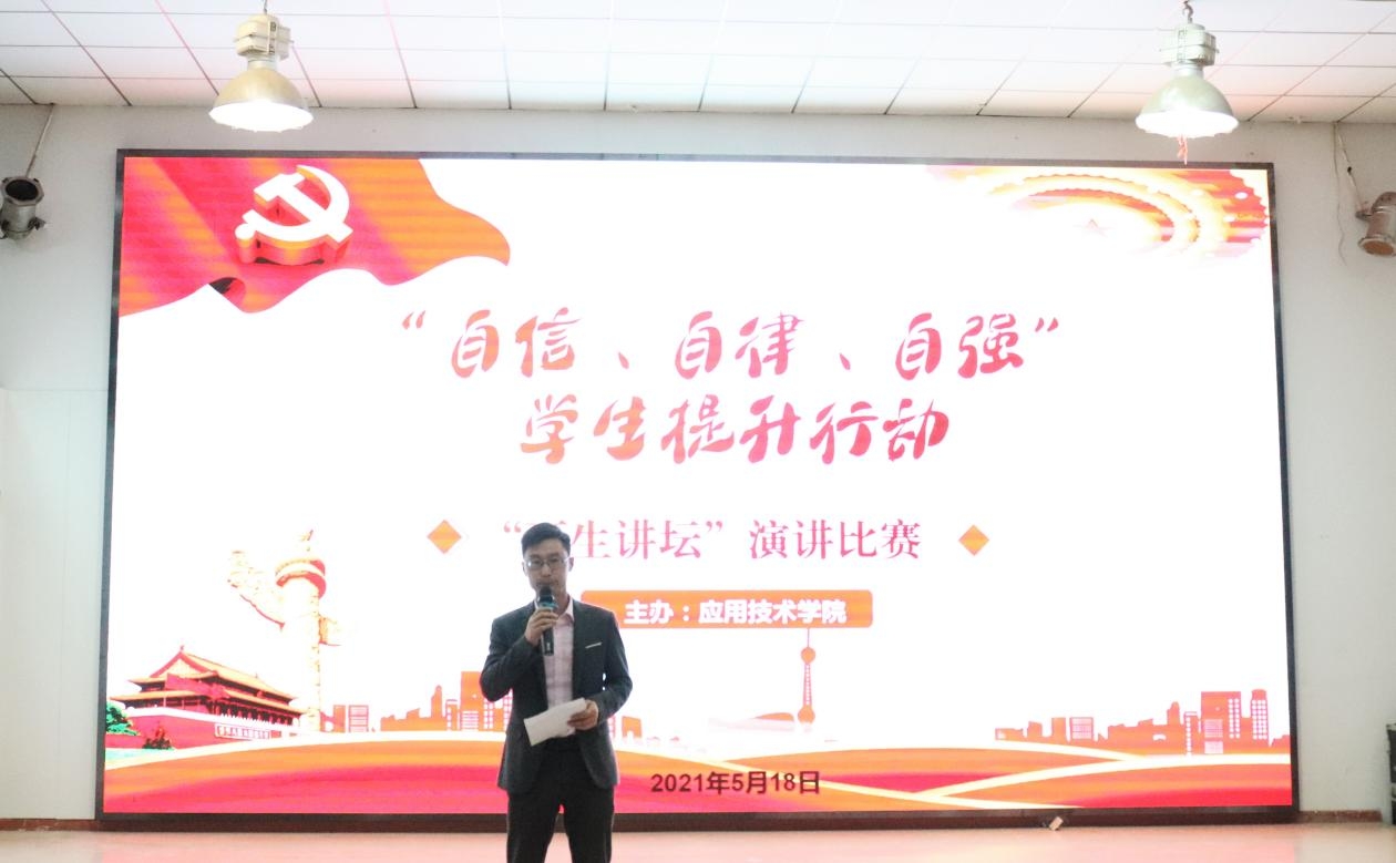 为进一步学习宣传贯彻习近平新时代中国特色社会主义思想,落实习近平总书记在党史学习教育动员大会上的重要讲话和指示精神,以庆祝中国共产党成立100周年为重大契机,通过进支部、进社团、进网络、进团课。引导更多青年学子做到学史明理、学史增信、学史崇德、学史力行,应用技术学院分团委于2021年5月18日晚19时在体育馆403室举行了“自信、自律、自强”学生提升行动--“百生讲坛”演讲比赛。莅临比赛现场的嘉宾有:学校宣传部部长彭宠老师、校团委书记邱玉添老师、思政课部李纪明老师、管理学院分团委书记张力老师、应用技术学院院长金学武老师、党总支副书记海鹏老师、办公室主任汪雅乔老师、分团委书记梁爽老师以及来自学院的全体辅导员老师们,同时彭宠老师、邱玉添老师、李纪明老师、张力老师、海鹏老师担任本次演讲比赛的评委。