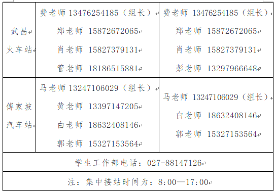 2021年9月11日、12日是我校新生报到日。为方便广大新生顺利报到,我校在汉口火车站、武汉火车站、武昌火车站、傅家坡长途汽车站四个站点设有迎新接待点,并安排有迎新专车接站。现将各站点接站老师及其联系方式公布如下: