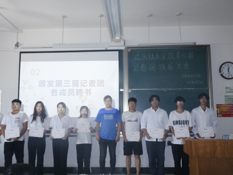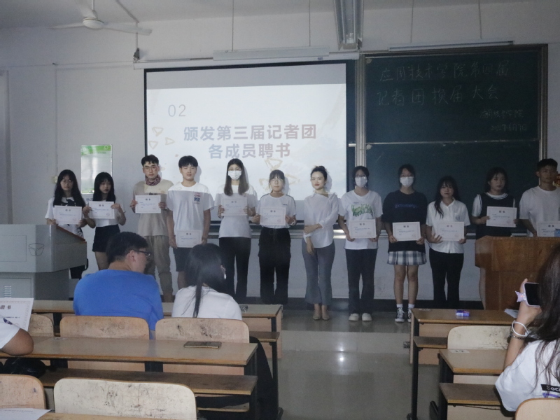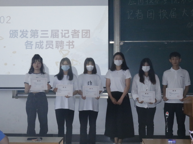 图为梁爽老师为记者团团长和各个部长颁布证书