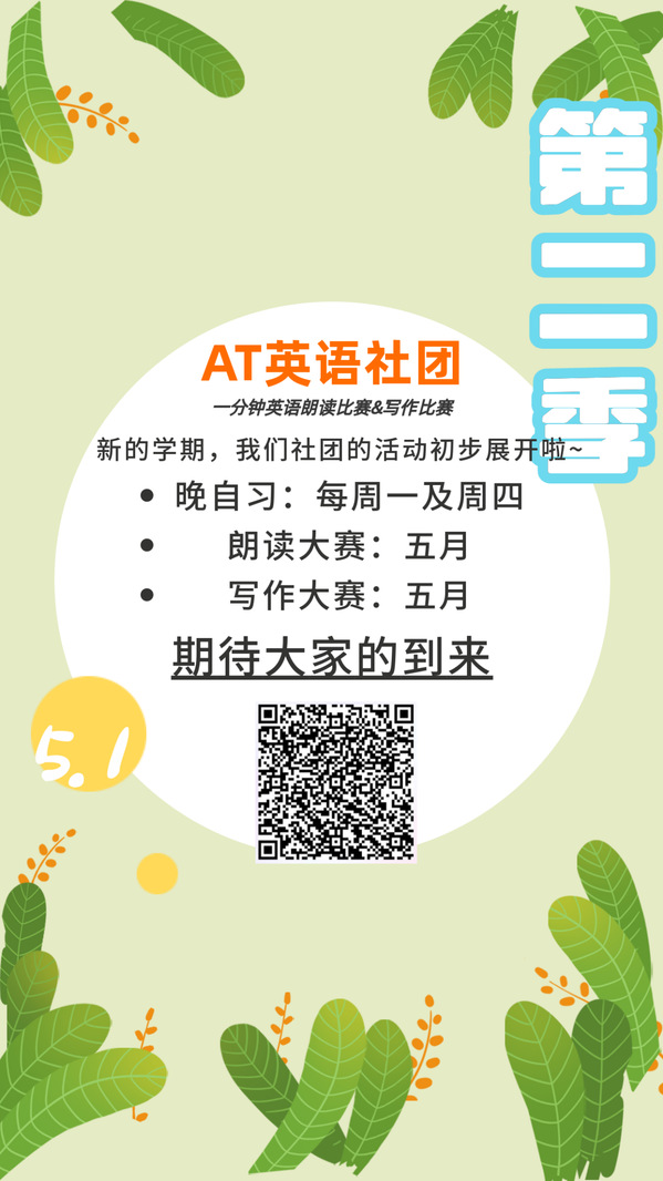 (通讯员:蔡旭)新的⼀年,新的学期。AT英语社团的活动又开始啦!AT英语社团英是⼀个以培养学生英语综合能力、增强学生英语学习自信心为宗旨的社团。它通过丰富多彩的英语活动,如英语晚自习、写作比赛、朗读比赛等活动来提升学生的英语能力。