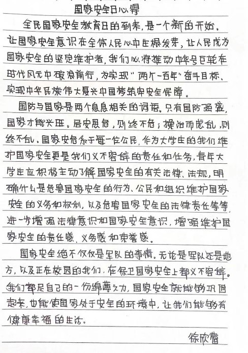 在如今信息化丰富的时代,大家不仅要掌握安全知识更要明辨是非,每多一个有良好安全知识掌握的人,违法犯罪的事便少一分。所以在自身了解国家安全教育的同时也不要忘记自己的家人、朋友、同胞。相信大家在新时代科技带来更加异彩纷呈的世界里能够重视安全问题、在知识的庇护下面对陷阱能够正确分辨,做一个维护国家安全的好公民,站在讲政治的高度,迅速适应中央新要求、达到新标准,在各自岗位上守土有责、守土尽责,为党的长期执政、国家长治久安、人民安居乐业夯实基础。