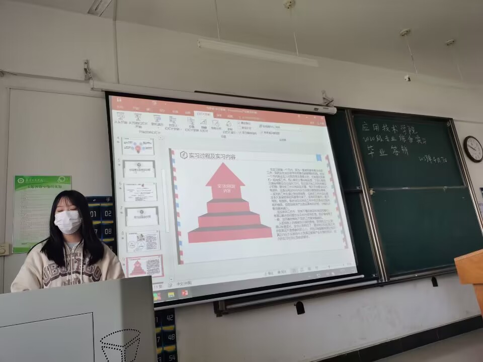 答辩开始,同学们一一上台展示。答辩讲台上,每位同学轮流上台总结自己6个月的实习工作,将自己在实习期间的工作情况、所遇到的问题、实习报告的撰写以及对实习单位、学校的建设性意见进行了详细的阐述,流畅的演讲呈现出同学们对实习的深刻认识。