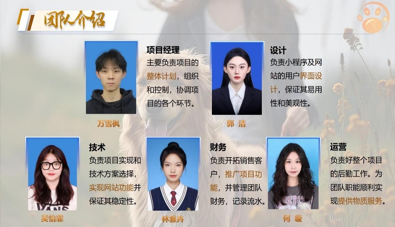 图为“宠伴”团队成员 “宠伴”团队融合了来自不同年级和专业的优秀学生,他们因为“宠伴”相识,相知,并成为了一起并肩作战的好朋友。他们以独特的视角和深入的市场调研,提出了一套全新的宠物寄养服务解决方案。他们深入了解了宠物主人的需求,结合互联网技术,设计了一个便捷、可信赖的平台,为宠物主人提供了全方位的寄养服务。这一创新模式不仅满足了宠物主人对于宠物寄养的需求,还为宠物寄养市场带来了新的商业机会。 “宠伴”团队的主讲人何璇在比赛现场巧妙地结合了PPT视频动画及平台展示,生动地展现了他们的创业项目。他们的路演和答辩内容涵盖了项目的创新创意点、市场分析、核心产品、可行性分析、风险评估以及未来发展规划等多个方面,充分展现了他们的商业理念和策略。