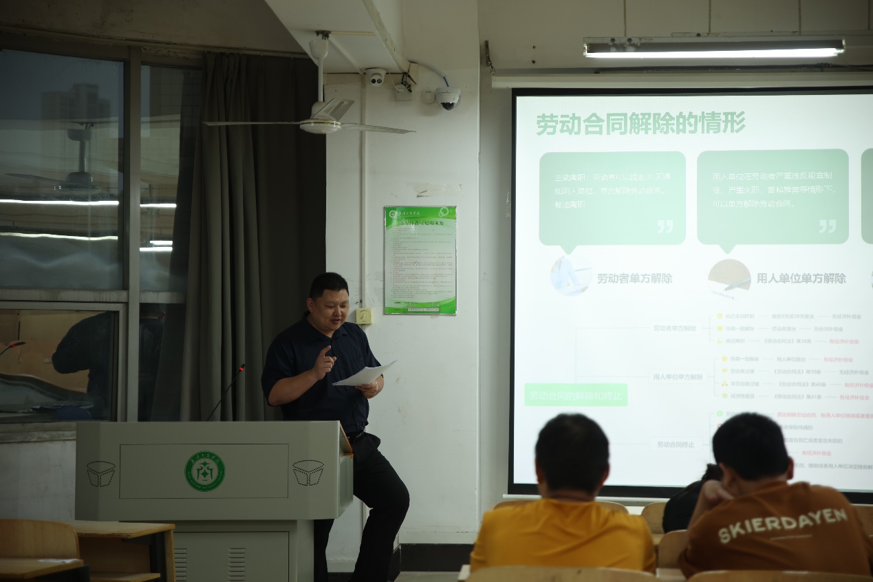 杨大虎老师从实习与就业的关系、认识劳动合同以及劳动安全三个方面进行详细的讲解。“作为实习生身份,接受学校和实习单位的双重管理,属于完成学业的一部分。”杨老师为同学们介绍到,学习劳动法规、了解劳动关系有利于学生在职场中保护自己的权利以及学生法律知识的健全。明确职场人这一身份,正确理解身为职场人的权利和义务,有助于学生长远发展。