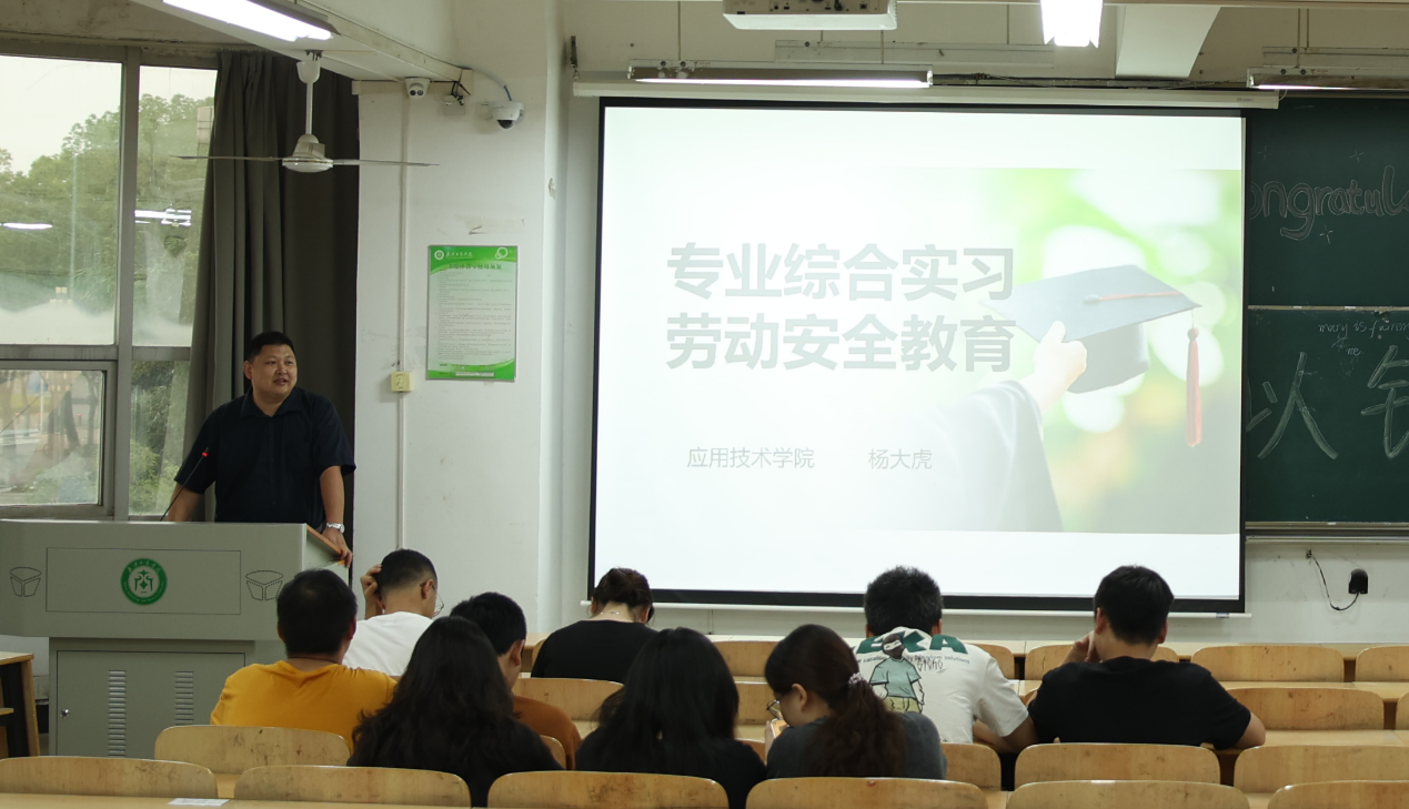 为对即将踏入实习岗位的2022级学生准确地认识专业实习和劳动安全,6月16日,应用技术学院于综合楼206教室举办了主题为“专业综合实习 劳动安全教育”的专题讲座,本次讲座主讲人为杨大虎老师。