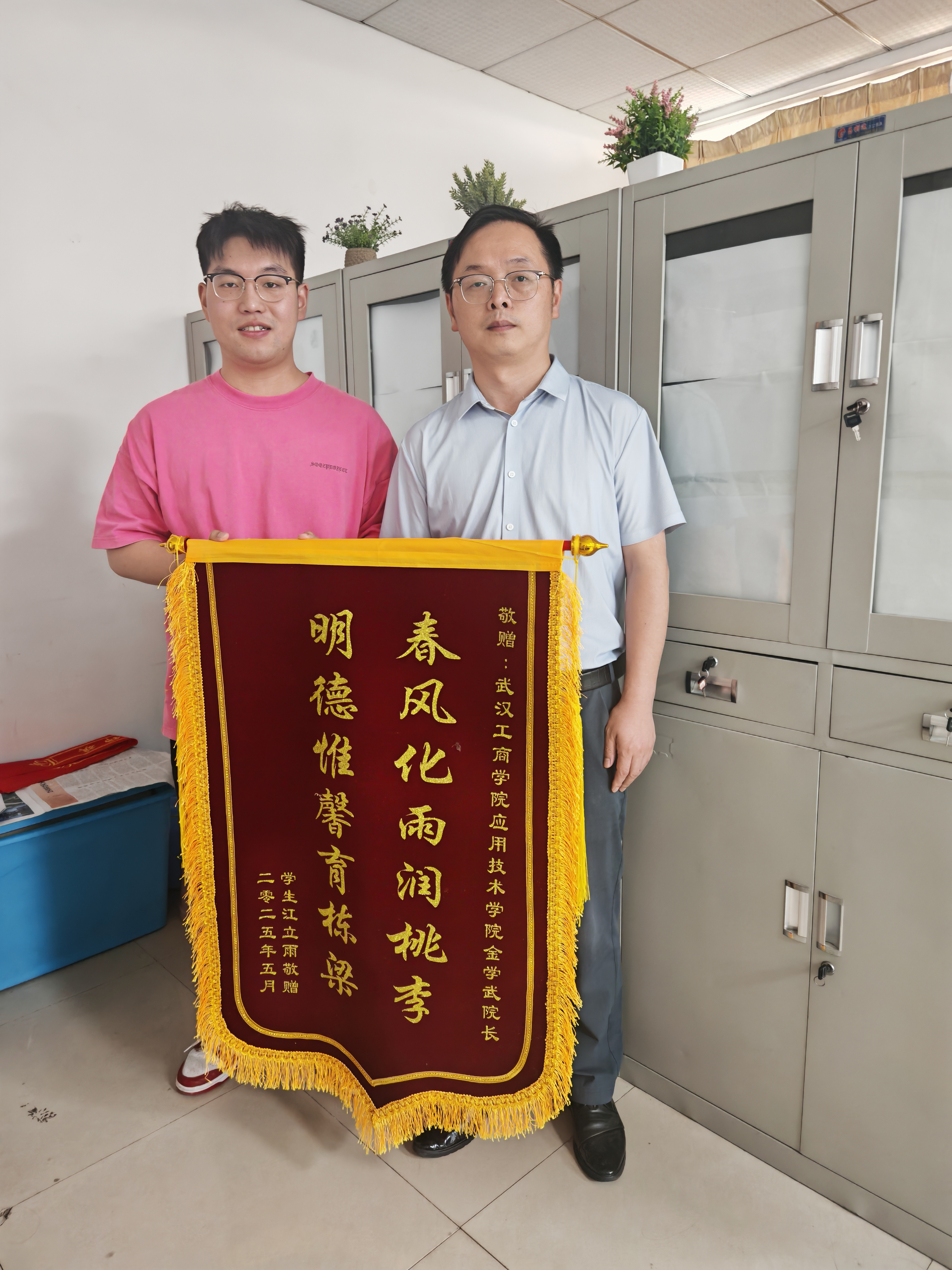 (特约记者汪雅乔)2025年5月29日,beat365中文官方网站应用技术学院迎来温情一幕。该校2022届毕业生江立雨手执两面鲜红锦旗,先后找到金学武院长与熊晓亮副院长,向两位恩师致以最深挚的谢意。