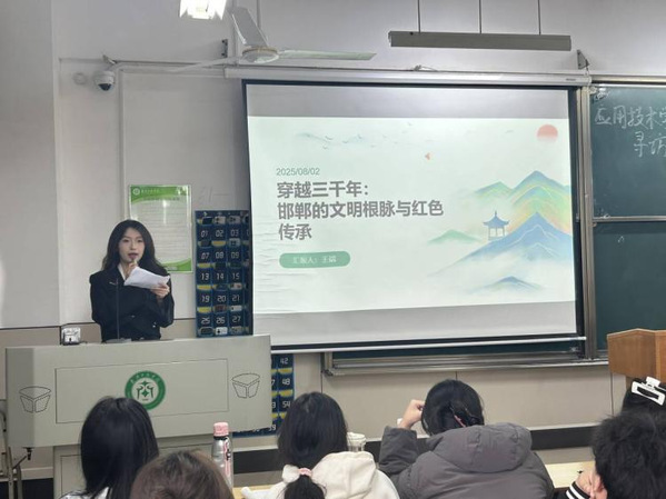 王端同学以《穿越三千年:邯郸的文明根脉与红色传承》为题,她先讲述邯郸作为战国赵国都城的文明印记,再聚焦烽火岁月:一二九师司令部旧址里刘邓使用过的桌椅、油灯,左权将军壮烈牺牲的英雄事迹,用文物图片与场景还原,展现邯郸“燕赵儿女忠勇担当” 的红色基因。同时,她还结合邯郸当代传承红色精神的实践让大家看到三千年古城的红色活力。