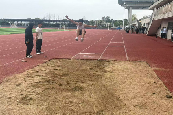 助跑道上,同学们目光坚定,从加速到起跳,一气呵成。有的身轻如燕,在空中走出一道优雅的弧线;有的力量十足,踏跳瞬间沙土飞扬,气势如虹。
